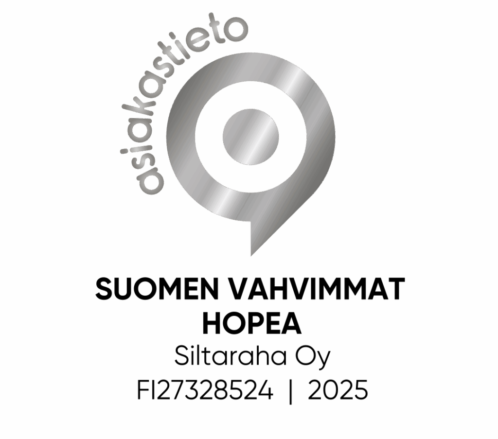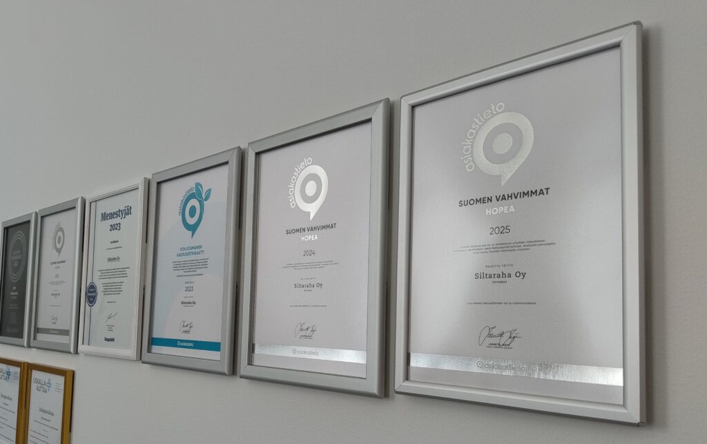 Siltarahan toimiston seinää komistaa kolmatta vuotta peräjälkeen Suomen Asiakastiedon myöntämä, Suomen vahvimmille yrityksille suunnattu sertifikaatti. Kuten Asiakastieto mainitsee, niin "Suomen Vahvimmat yritykset ovat talouden tukipilareita, jotka vahvistavat ja vakauttavat talouselämäämme. Sertifikaatti on merkki yrityksen positiivisista taloudellisista tunnusluvuista, luottokelpoisuudesta, taustatiedoista ja hyvästä maksukäyttäytymisestä". Haluamme siis jälleen tällä tavoin kertoa sekä asiakkaillemme että yhteistyökumppaneillemme, että yhteistyö on kestävällä pohjalla.