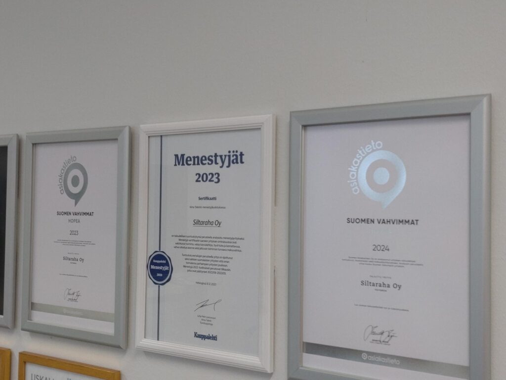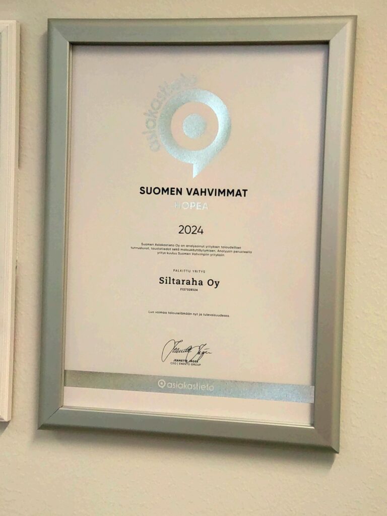 Siltarahan toimistolla kiinnitettiin taas uutta kehystettyä sertifikaattia seinään. Siltaraha on vastaanottanut Asiakastiedon myöntämän Suomen Vahvimmat -sertifikaatin. Sertifikaatti on merkki yrityksen positiivisista taloudellisista tunnusluvuista, vahvasta luottoluokituksesta ja hyvästä maksukäyttäytymisestä. Sertifikaatti kertoo siitä, että yrityksen toiminta on kestävällä pohjalla.